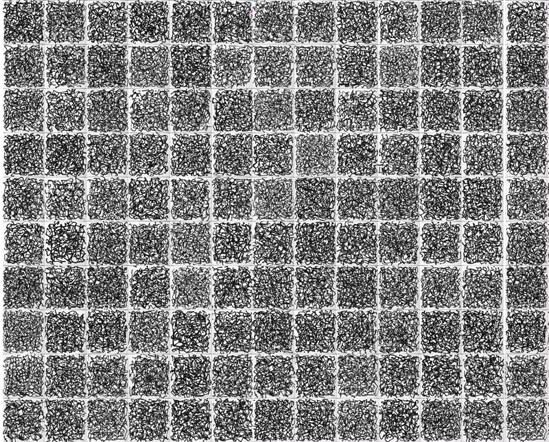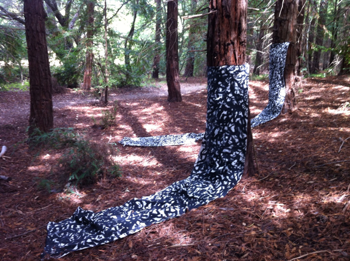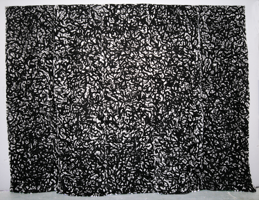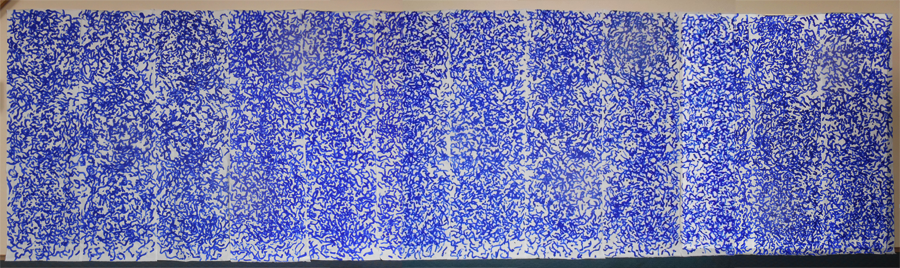 Mastery Of No Attainment (The Door Of The White Father Dissolves) - 72"x300" on 5 panels - acrylic on canvas - 2023 (larger depiction) Fluxations in Static Blue - 144"x576" - acrylic on fabric - 2018 (larger depiction) Forest Fog (Afterglow in the Elements) - 5 at 84"x36" - ink on paper - 2019 (detail) Art In Nature Festival - acrylic on muslin - 2012 10,000 Faces Outward Look - 50"x85" - paint pen on plasrtic cards - 2009 Blue Imprint - acrylic on paper - 96"x336" - 2009 La Chute - acrylic on muslin - 132"x168" - 2007 (larger depiction)